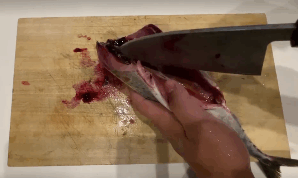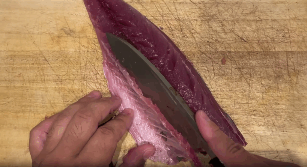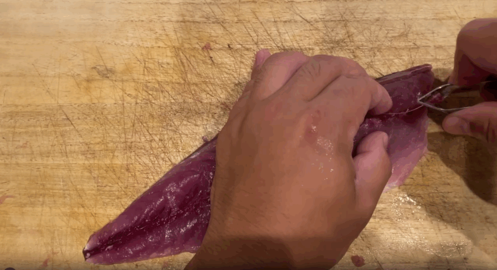 腹ビレ側も同様に、背骨まで包丁を入れます。